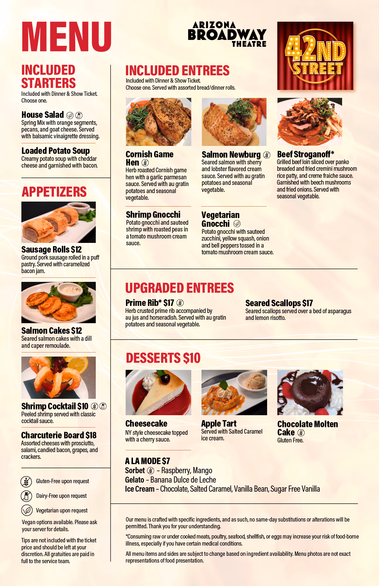 Arizona Broadway Theatre offers a one-of-a-kind dinner-and-show experience. Dinner & Show tickets include soup or salad and an entrée, with upgraded options available. Matinee dining begins at 12 p.m., and evening dining starts at 5:30 p.m. Guests with Performance Only tickets can enjoy cocktails and beverages from the lobby bar before curtain and during intermission.