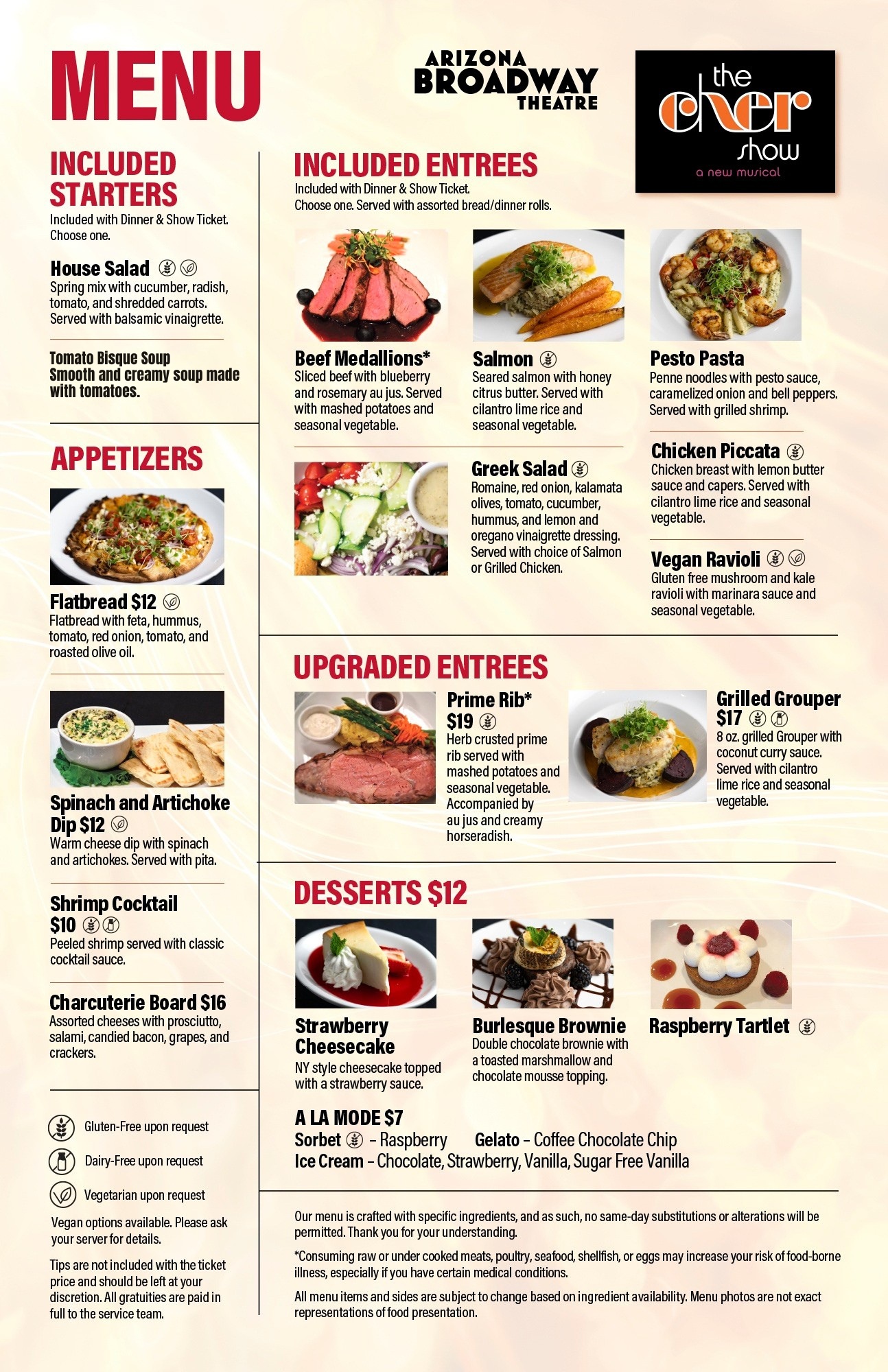 Arizona Broadway Theatre offers a unique dinner-and-show experience. Dinner & Show tickets include soup or salad and an entrée, with upgraded options available. Matinee dining begins at 12 p.m., and evening dining starts at 5:30 p.m. Guests with Performance Only tickets may enjoy cocktails and beverages from the lobby bar before curtain and during intermission. Seating for performance-only guests begins 15 minutes before showtime.